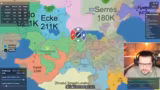 04:03:47Der Streamer befindet sich in einer aussichtslosen Position. Obwohl er versucht, sich mit anderen Spielern zu verbünden und seine Wirtschaft durch Häfen und Schiffshandel aufzubauen, wird er von allen Seiten angegriffen. Seine Startposition macht es unmöglich, sich zu verteidigen. Nach mehreren vergeblichen Versuchen, sich zu verteidigen und gegnerische Schiffe abzufangen, wird er mit Atomwaffen vernichtet und aus dem Spiel eliminiert.