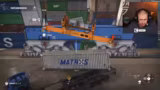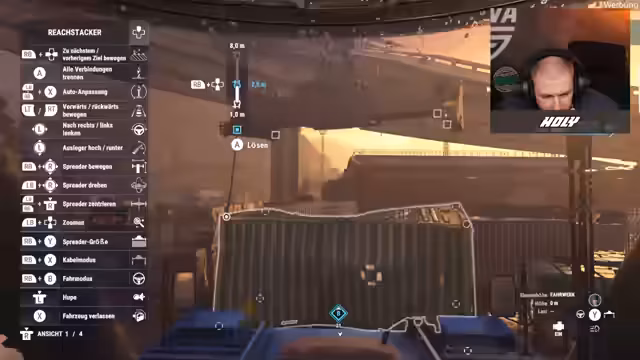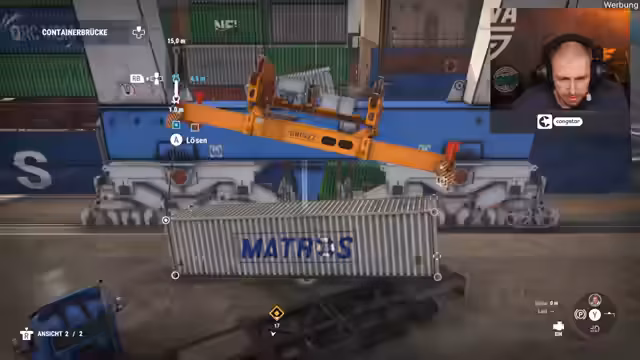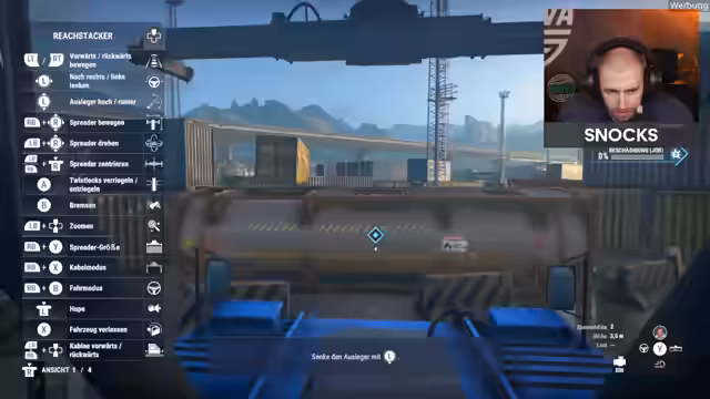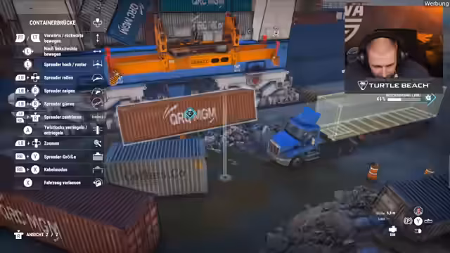 02:40:29Der Streamer beginnt mit dem Spiel "Hafenarbeiter", in dem er Container umschlagen und transportieren muss. Die Aufgaben erweisen sich als technisch anspruchsvoll und fehleranfällig. Bei der Handhabung des Spreaders und des Spreadertwistlocks kommt es zu ersten Schwierigkeiten, und der Streamer kämpft mit der Steuerung und der Physik des Spiels, was zu Frustration und humorvollen Kommentaren führt. Zunächst muss er die Reparatur eines Schadens an einem Schiffsteil vornehmen, um anschließend Frachtcontainer zu verladen.