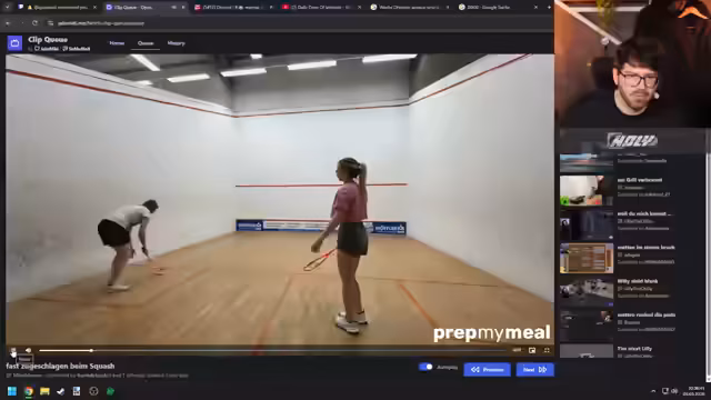 04:34:35Der Streamer wechselt zu persönlichen Anekdoten und einem spontanen Thema. Er erzählt von einem komischen Schlaf-Erlebnis, bei dem er einen Oropax-Wachsstöpsel wie Kaugummi im Mund gekaut hat. Danach geht er auf das Thema Sport ein, insbesondere Squash, welches er in der Schule spielte. Anschließend erwähnt er seine Midlife-Crisis, die sich in einem Cabrio-Kauf niederschlägt, und unterhält sich humorvoll über gescheiterte Versuche, auf Englisch zu flirten.