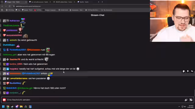 00:28:46Es wird angekündigt, dass während des Sabaton-Events Ende September ein IRL-Stream mit Milchbaum und Kaddi im Bonjwa-Studio stattfinden wird. Zudem wird ein Turnier für den Sabaton geplant und eine Reise zu einem Event nach Köln erwähnt. Es wird überlegt, ob es eine Neuauflage von King of Lahn geben wird. Des Weiteren wird ein Schachturnier in Aussicht gestellt, für das Jan als Partner gewonnen werden konnte. Es werden Überlegungen zu einem besonderen Twist für das Turnier angestellt, um es von normalen Schachturnieren abzuheben. Ideen wie ein Handbrain-Turnier oder Schach und PUBG gleichzeitig werden diskutiert.