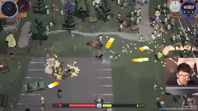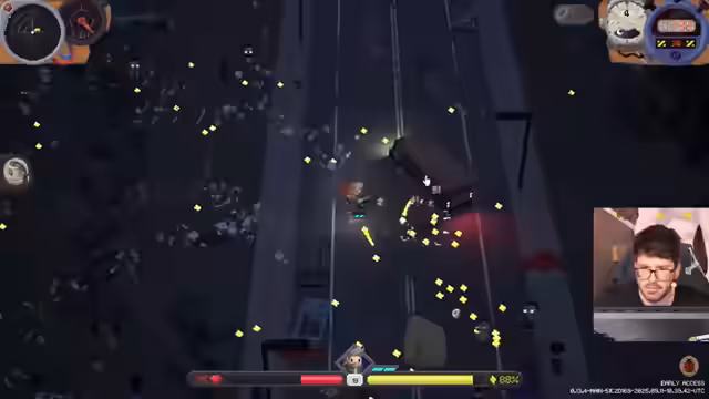 06:28:30Der Streamer erkundet die grundlegenden Spielmechaniken, darunter das Waffensystem, bei dem er zwei Waffen gleichzeitig nutzen kann, und das Level-System, das ihm Drops bringt. Er findet heraus, dass das Sammeln von Benzin zum Fortbewegen notwendig ist und verschiedene Items wie Rollerblades für verbesserte Beweglichkeit verfügbar sind. Er diskutiert auch die Waffen-Upgrades und deren Effekte auf den Schaden und die Geschwindigkeit.