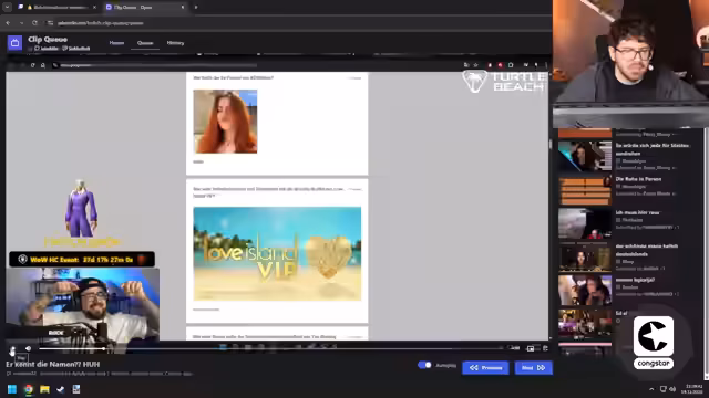 01:35:16Der Streamer äußert sich beeindruckt von einer Stimme und spekuliert über die Möglichkeit, solche Voice-Actor-Stimmen zu trainieren. Er bittet darum, einen bestimmten Clip mit 'Edo' erneut zu sehen, um eine 'wütende Energy' zu erzeugen, da er sich über die Dummheit einer Aussage aufregt. Es folgt ein Quiz, bei dem Fragen zu 'Love Island VIP' gestellt werden. Der Streamer gibt zu, keine Ahnung von der Show zu haben und fragt sich, was 'Love Island VIP' von der regulären Version unterscheidet. Er ist überrascht über das Wissen eines anderen Teilnehmers, der die Namen der Teilnehmer nennen kann, und scherzt über die ähnlichen Namen der Kandidaten, bis der Name 'Maurice' fällt, der nicht ins Schema passt. Eine Staffel mit 'Maurice' und 'Maurice Weber' würde er jedoch gerne sehen.