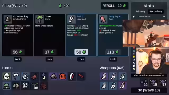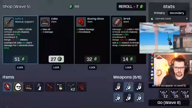 02:51:51Der Streamer kämpft weiterhin mit der Herausforderung, beide Spiele parallel zu managen. Der Fortschritt in "Getting Over It" ist weiterhin langsam und frustrierend, während der Fokus in "Brotato" auf dem Sammeln von Ressourcen und dem Überleben liegt. Er analysiert das Spielsystem von "Brotato" und überlegt, ob das Skillen von "Harvesting" das maximale Geld pro Welle erhöht, was auf eine langfristige Strategie hindeutet. Trotz der Rückschläge und der hohen kognitiven Anforderung, die "Gehirn goes boom" zur Folge hat, bleibt der Streamer bei der Challenge und versucht, die Leistung in beiden Spielen zu optimieren.