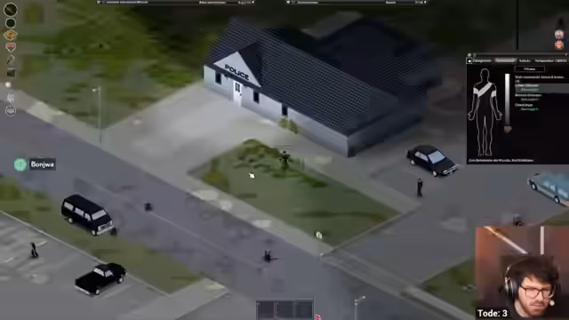 10:23:06Nachdem der Räuber das Auto gestohlen hat, kehrt er später zurück und wird nun verdächtigt, ein Spieler zu sein, anstatt ein NPC. Ein Mitglied, Peter, wird währenddessen von einem Zombie gebissen. Obwohl es versucht wird, die Infektion mit einer Bourbon-Bandage zu behandeln, ist das Schicksal des Mitglieds ungewiss. Die Führung wird neu verteilt, und die Spannungen innerhalb der Gruppe wegen des Räubers und der Infektion nehmen zu.