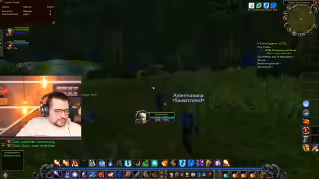 05:22:07Zu Beginn des Streams wird über verschiedene Alltagsgeräusche wie das Schälen von Kartoffeln und das Verhalten von Obst wie Kiwi gesprochen. Der Streamer erwähnt seine drei Kinder und seine 22-jährige Erfahrung mit World of Warcraft. Das Hauptthema ist das gemeinsame Questen im Spiel, insbesondere im Gebiet um den Hafen, wo sie Quests absolvieren und auf bestimmte Monster respawnen warten. Es werden auch technische Aspekte wie das Makro für Mouse-Over-Heals besprochen, um das Heilen zu optimieren und effizienter zu gestalten.