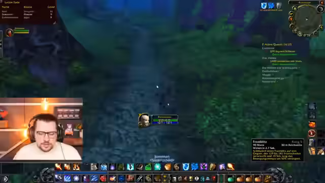 05:09:49Zum Ende des Streams wird das Leveln im Sumpfland fortgesetzt, während der Streamer versucht, seine letzten Quests abzuschließen. Ein Charakter stirbt knapp, weil ein unerwartet starker Mob auf ihn trifft. Der Streamer erklärt die Mechanik von Formwechseln bei Druiden und Priestern und gibt weitere Tipps zur Ressourcenverwaltung. Bevor der Stream gegen 16 Uhr endet, werden noch schnell Handelsspiele und Lieder im Chat angesprochen.