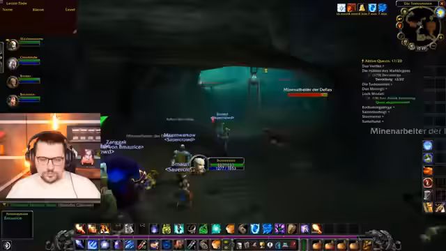 02:20:01Nach dem Betreten der Mine werden die Buffs erneuert, da der Priester-Buff nur für sechs Minuten hält. Der Streamer weist darauf hin, dass die nachfolgenden Gegner Elite-Mobs sind und als Level-19 nicht alle auf einmal getankt werden können. Man entscheidet, die Minenarbeiter einzeln zu_pullen und einen Konzentrationseffekt für den anstehenden Kampf zu nutzen. Der Streamer gibt maxim den Ratschlag, als Tank immer die Gegner anzuklicken, um deren Bilder und Status zu überprüfen.