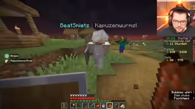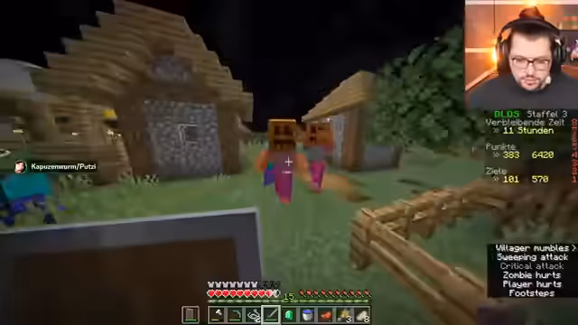 00:27:06Der Streamer und der Chat analysieren die Tode anderer Teilnehmer, um daraus für das eigene Spiel zu lernen. Viele Spieler sind bereits früh im Event gestorben, oft durch Creeper, die auf dem Schwierigkeitsgrad „Hard“ extrem gefährlich sind und selbst Spieler mit voller Eisenrüstung mit einem Schlag töten können. Ein Beispiel ist der Tod von Hyuga und DJ Dracy durch Zombies und einen Creeper in einer Höhle. Auch der Tod durch einen Stalaktiten wird thematisiert, wobei der Streamer und der Chat experimentieren, wie man Schaden durch Tropfsteine vermeiden kann. Ein weiterer Spieler, Sepp, starb, weil er sich in Lava ausloggte, um sich zu retten, konnte sich aber wegen eines langsam ladenden Resource Packs nicht rechtzeitig wieder einloggen. Auch Peter starb, als er während einer komplexen Achievement-Erklärung aus dem Spiel tabte und von einem Creeper überrascht wurde. Besonders gefährlich sind auch Drowned-Zombies mit Dreizack und Baby-Zombies, die schnell und schwer zu treffen sind. Eine besondere Gefahr stellen geladene Creeper dar, die durch Blitzeinschläge entstehen und extrem hohen Schaden verursachen können, sogar durch Schilde hindurch. Das Achievement, einen Kopf durch die Explosion eines geladenen Creepers zu erhalten, wird als sehr risikoreich eingestuft. Die Analyse zeigt, dass Mobs auf dem eingestellten Schwierigkeitsgrad nicht unterschätzt werden dürfen und ein offenes Inventar in kritischen Situationen oft zum Tod führt.