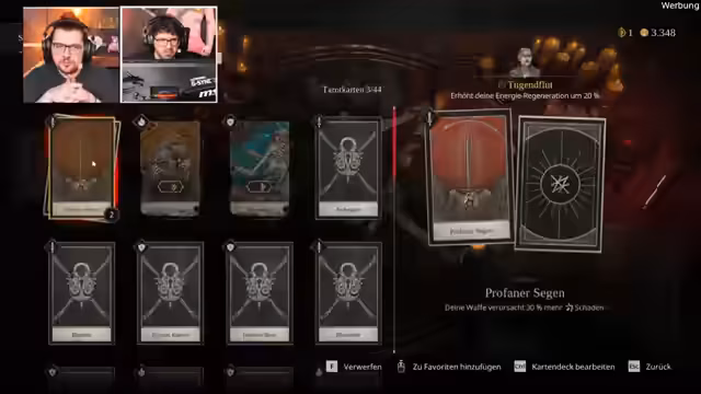 08:02:50Die Spieler diskutieren über die Effekte von Waffen-Upgrades wie Wurfsternen, die abprallen, und Multi-Hits. Es wird über die Vorteile von Flächenschaden und Einzelzielschaden bei Gegnerhorden gesprochen. Anschließend wählen die Spieler Tarotkarten für ihren Run aus, die Modifikationen wie mehr Schaden, Munition oder Gold bieten. Die Lotterie-Funktion ermöglicht das Ziehen von zwei Karten. Die Entscheidung für 'Doppelt gesegnet' (zweimal so viel Gold) und 'Profaner Segen' (30% mehr Waffenschaden) wird getroffen. Die Spieler wählen ihre Charaktere, wobei einer die Munitionskapazität um 50% erhöht und ein anderer den Waffenschaden um 10% steigert. Die Wahl des Charakters und Skins wird besprochen, wobei 'Die Nonne' aufgrund ihrer Attribute und des passenden religiösen Gewands gewählt wird.
