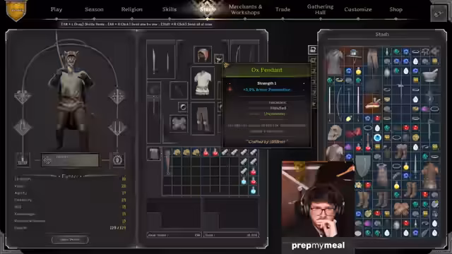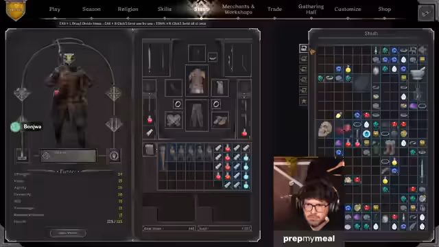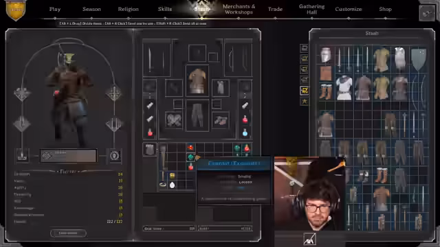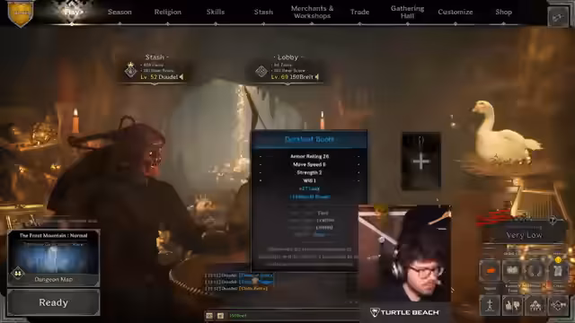 01:54:01Zu Beginn des Zeitabschnitts beschäftigt sich der Streamer intensiv mit seinem Character, der bereits ein fast vollständiges High-Roller-Set besitzt, jedoch nur noch einen Helm und keinen Schmuck trägt. Dies führt zu einer Diskussion mit den Zuschauern über den Status ihrer Sets und die Möglichkeit, im Hochrisiko-Modus High-Roller zu spielen, falls das aktuelle Equipment im Kampf verlorenginge. Gleichzeitig wird das Problem der beengten Inventarplatzes erwähnt, der eine vollständige Beuteernte von Valuables erschwert, da ständig Gold für Consumables ausgegeben werden muss.
