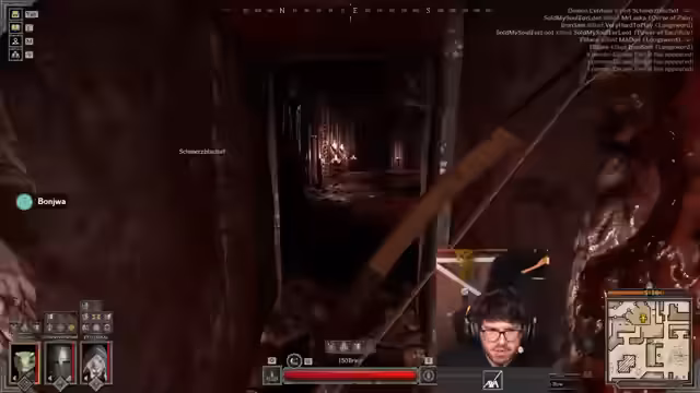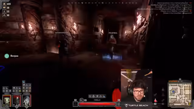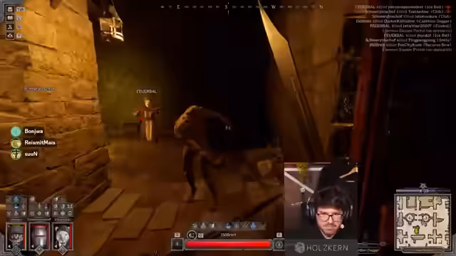 01:59:26Der Fokus liegt auf einem intensiven PvP-Geschehen in einer Burg, in dem mehrere Spielergruppen gleichzeitig kämpfen und sich gegenseitig Eliminierungen ("Rapierkill", "Zweihänderkill") zufügen. Der Streamer analysiert die Kämpfe, versucht Spuren und Türen zu verfolgen, um die Position der Feinde zu bestimmen, und nutzt geschickt Deckung und Bewegung ("Kalte weiter"), um Angriffe abzuwehren. Er erzielt dabei einige "geile Hits" und eliminiert Gegner, während sein Team ihn unterstützt und ausbucht.