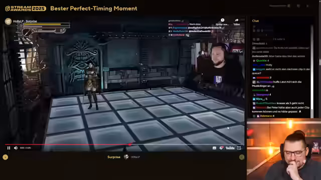 00:42:13In der Kategorie „Bester IRL-Moment“ werden sechs Clips vorgestellt. Der erste Clip mit Ronny, Sterzig und HandOfBlood wird als inszeniert empfunden, da Max' Rolle als „Rentner“ forciert wirkt. Der zweite Clip, in dem eine Frau einen Streamer auf einer öffentlichen Veranstaltung wegen Datenschutz anspricht, wird als authentisch und unterhaltsam bewertet, da die Situation spontan und ungestellt ist. Der dritte Clip zeigt, wie der Chat Edeltour-Streamern den Zugangscode zu ihrem Campingplatz liefert, was als „crazy“ und surreal beschrieben wird. Der vierte Clip, in dem ein Vogel auf den Kopf eines Streamers kackt, ist ein zufälliger und lustiger Moment. Der fünfte Clip zeigt einen Streamer, der ein Meerschweinchen streichelt, das daraufhin erbricht, was als unglücklich und zufällig empfunden wird. Der sechste Clip zeigt den Vater eines Streamers, der unerwartet in einem IRL-Stream auftaucht. Der Streamer wählt den Datenschutz-Clip als seinen Favoriten. Für den „Besten Gaming-Moment“ bewertet er seinen eigenen Clip als nicht gut genug. Gronkhs Auftritt bei Craft Attack, wo er sein „Kohle, Kohle, Kohle“-Lied singt und alle anderen Streamer ihn anbeten, wird als starker und nostalgischer Moment hervorgehoben und als Favorit gewählt. Die Kategorie „Bester Skill-Moment“ beginnt mit einem GeoGuessr-Clip, der ein Comeback auf Pro-Niveau zeigt. Ein weiterer Clip zeigt DIVI bei einem 100 No-Death-Run in Dark Souls, was als beeindruckend, aber nicht als krassester Skill-Moment empfunden wird. Densen, der einen No-Hit-Run in einem Bosskampf absolviert, wird als sehr stark bewertet. Kutscher, der Morgoth blind mit einer Keule besiegt, ist ebenfalls beeindruckend. NNO, die den amtierenden Weltmeister T1 in League of Legends besiegen, wird als historischer Moment für die deutsche Szene gefeiert. Ein Mario World Speedrun mit einer verrückten Abkürzung rundet die Kategorie ab. Der Streamer schwankt zwischen Densen und NNO, entscheidet sich aber für Densen.