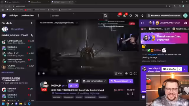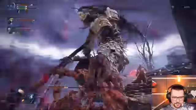 03:14:55Die Gruppe konfrontiert einen schwierigen Boss, einen 'Ancient Dragon Knight'. Der Streamer beschreibt den Kampf als extrem fordernd und vergleichbar mit den härtesten Bossen in anderen Souls-Spielen. Der Boss nutzt Fähigkeiten wie 'Grab-Attacken', die blauen Blitzen verursachen, und führt schnelle Angriffe aus. Der Streamer selbst erlebt einige gefährliche Momente und ist nah am Tod. Trotzdem gelingt es der Gruppe, den Boss durch geschicktes Ausweichen, Parieren und das Nutzen von Ultimates zu besiegen, wobei am Ende der Schwanz des Bosses abgeschlagen wird, was einen bemerkenswerten Erfolg darstellt.
