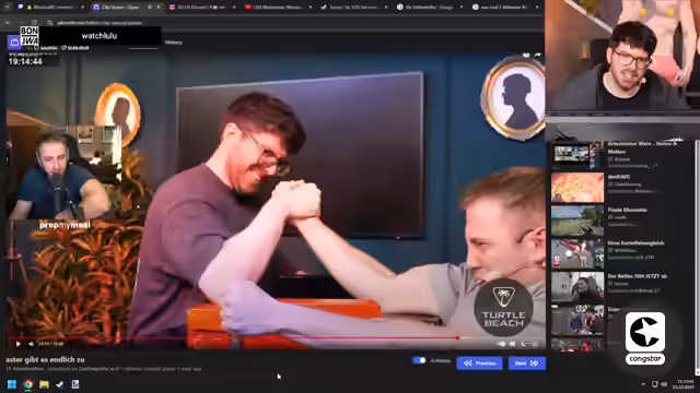 06:13:09Es wird über die Einrichtung eines Fitnessstudios im Bonjwa-Gebäude gesprochen, das von Jen betreut werden soll. Der Streamer scherzt über die zukünftige Nutzung des Studios, indem er ankündigt, die anderen Mitarbeiter, insbesondere Aster, regelmäßig zum Training zu zerren und deren sportliche Fortschritte zu überwachen. Er stellt sich vor, wie sich die Mitarbeiter Ende 2026 zu 'muskulösen Männern' entwickeln und sogar einen Kalender im Stil der 'Chippendales' oder 'Magic Mike' erstellen könnten, mit Verkleidungen wie Feuerwehrmännern oder Düsenjet-Piloten. Die Idee eines Pizzaboten als 'sexiest thing' wird humorvoll aufgegriffen. Kurz darauf wird ein technisches Problem im Stream festgestellt, bei dem das Gameplay von Aster fälschlicherweise als die eigene Sicht des Streamers angezeigt wird, was umgehend an Janik weitergeleitet wird.