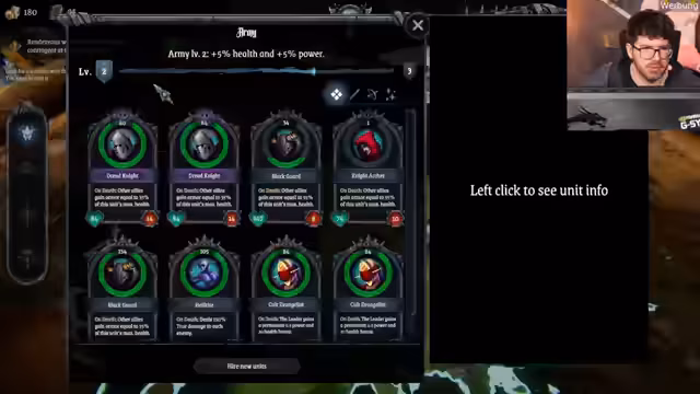 07:43:44Der Streamer konzentriert sich auf die Optimierung der Armee und Edikte. Es wird die Möglichkeit untersucht, Einheiten zu leveln, wobei festgestellt wird, dass dies nur möglich ist, wenn ein gelber Pfeil über dem Skill angezeigt wird, was auf ausreichend gesammelte EP hindeutet. Bogenschützen werden gelevelt, um mehr Schaden zu verursachen. Das Sparen von Gold für zukünftige Käufe wird priorisiert, da die Armee bisher wenig Verluste erlitten hat. Der Streamer entscheidet sich, Erfahrungen für die Armee zu sammeln, um Armeestufe 2 zu erreichen und weitere Level-Ups freizuschalten. Insbesondere wird die passive Fähigkeit zur Anwendung von 'schrecklichen Wunden' bei Angriffsschaden untersucht, kann aber aufgrund fehlender Bücher nicht sofort verbessert werden. Edikte wie 'Echo der Leere' (entfernt negative Statuseffekte) und 'Champion Stufe 1' (reduziert eingehenden Schaden) werden in Betracht gezogen. Der Streamer entscheidet sich für einen dauerhaften Bonus auf die maximale Gesundheit des Anführers und bereitet sich auf einen Zwischenkampf vor, um die Hauptquest fortzusetzen. Die Wichtigkeit der Edikte und die strategische Platzierung von Einheiten, um Gold zu farmen, werden betont.