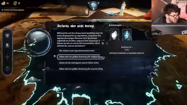 07:28:13Der Streamer entdeckt die Möglichkeit, seinen Leader in den Kampf zu rufen, indem er den Button mit den gekreuzten Schwertern drückt. Es wird jedoch hinterfragt, ob dies zu diesem Zeitpunkt strategisch klug ist. Das Edikte-System wird eingeführt, globale Fähigkeiten, die jederzeit während eines Zuges eingesetzt werden können und Edikt-Punkte (EP) verbrauchen. Standardmäßig erhält man zwei EP pro Zug, kann diese aber im Kampf erhöhen. Edikte können auf der Weltkarte erhalten und verbessert werden. Einige Edikte haben mehrere Ladungen und werden nach Gebrauch wieder in die Bibliothek gemischt. Der Streamer entscheidet sich, das Agentennetzwerk zu retten, um wichtigere Edikte zu erhalten. Edikte wie 'Klarheit' (verringert Fähigkeitsabklingzeit), 'Betäubt' (stellt Gesundheit wieder her) und 'Härten' (erhöht Macht) werden vorgestellt. Der Streamer wählt 'Härten', um den Anführer und Verbündete zu stärken. Eine weitere Entscheidung betrifft einen gefangenen Spion: Mehr Gewalt anwenden oder für einen Austausch behalten. Der Streamer entscheidet sich für mehr Gewalt, was zum Tod des Spions führt, aber die eigenen Bewegungen unbemerkt lässt.