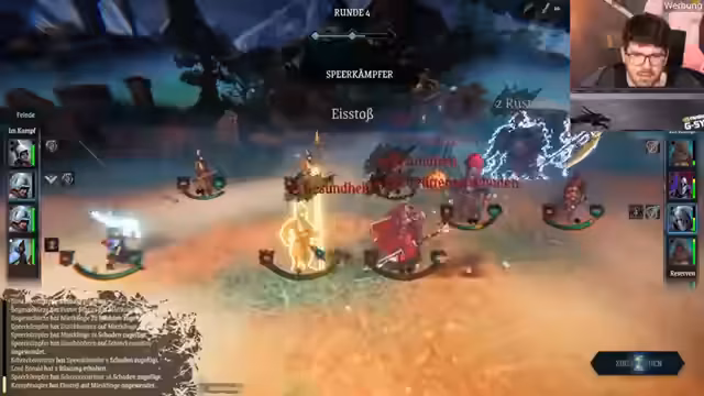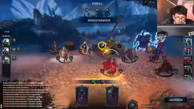 08:11:42Der Streamer bereitet sich auf einen Zwischenkampf vor, um die Hauptquest voranzutreiben. Es werden Einheiten wie Mietklingen und Schreckensritter positioniert, wobei die Mietklinge vorne platziert wird, in der Hoffnung, dass sie stirbt, um Gold zu generieren. Während des Kampfes werden Edikte wie 'Schattenrüstung' eingesetzt, um die eigenen Einheiten zu buffen. Der Streamer bemerkt, dass die Gegner sich auf die hinteren Einheiten konzentrieren, was taktisch ausgenutzt wird. Die Strategie, den Lord erst am Ende einzusetzen, um Last Hits zu erzielen und ihn dadurch zu stärken, wird verfolgt. Der Streamer spart Ediktpunkte, um einen mächtigen Mega-Angriff zu starten. Trotz einiger Rückschläge, wie dem Verlust eines Ritterleutnants, wird der Kampf fortgesetzt. Die Priesterin des Gegners erweist sich als besonders stark, da sie heilt und Statuseffekte entfernt. Der Streamer konzentriert sich darauf, die Priesterin mit Ediktpunkten zu attackieren und Blutungsschaden zu verursachen. Die Schwierigkeit des Bossfights und die Notwendigkeit, strategisch zu handeln, um die eigenen Einheiten nicht zu verlieren, werden deutlich.