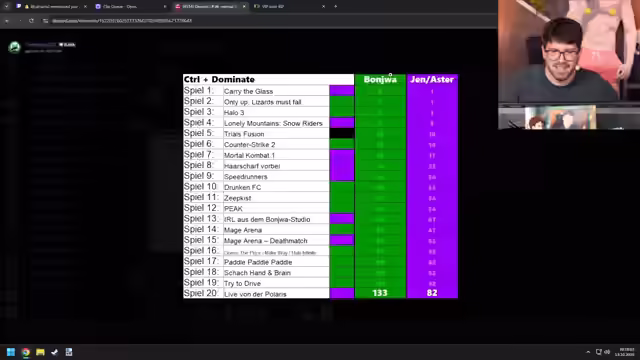 01:57:53Es wird eine Diskussion über einen 'Gigawurf' geführt, der auf einem Clip zu sehen ist, aber leider nicht gewertet wurde, da der Streamer nicht sehen konnte, wohin er warf. Anschließend wird der Spielstand von 'Control & Dominate' beleuchtet, wobei der Streamer die Ergebnisse als Betrug empfindet, da er glaubt, mehr Spiele gewonnen zu haben. Es wird festgestellt, dass nur die letzten beiden Spiele verloren wurden, was zu einem Endstand von 6 zu 9 führte. Der Streamer kommentiert, dass es für die Spannung des Events gut war, dass das gegnerische Team gewonnen hat, da ein 'Zu-Null-Sieg' langweilig gewesen wäre. Der aktuelle Punktestand im Jahresverlauf von 'Control & Dominate' wird mit 133 zu 82 für das eigene Team angegeben, und es wird humorvoll angemerkt, dass das gegnerische Team bis Jahresende Zeit hat, aufzuholen.
