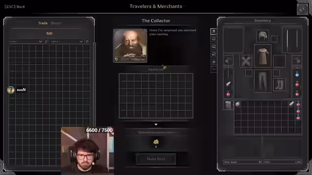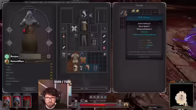 03:02:56Nach dem Bosskampf werden die Beute Gegenstände verteilt. Der Streamer findet ein besseres Cape, kann es aber nicht anziehen, da er dafür seine aktuelle Hose wegwerfen müsste, was er als dumm empfindet. Ein 'Knowledge Cape' und ein 'Insane Will Ring' werden gefunden. Es wird das Problem von vollem Inventar angesprochen, das es erschwert, nützliche Items wie Lockpicks mitzunehmen.