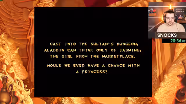 01:34:43Der Streamer konzentriert sich auf das Finale von 'Aladdin', indem er seine gesammelten Ressourcen und einen vollen Apfelvorrat nutzt. Er navigiert sich durch die letzte Phase des Spiels, einen Bosskampf gegen den Hauptantagonisten Jafar in seiner Statuenform. Er trifft eine finale Wette mit dem Chat, dass er das Spiel ohne einen einzigen 'Wish' (Game Over-Schutz) durchspielen wird, was er nach einigen knappen Momenten und durch die Ausnutzung der Spielmechaniken erfolgreich meistert.