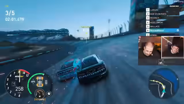 11:14:57Die Streamer wechseln von ihrer eigenen Strecke zu einem offiziellen Nesca-Event. Nach dem Finden und Beitreten der richtigen Gruppe in der Open World starten sie ein Rennen auf einer vorgegebenen Strecke. Das Rennen ist geprägt von strategischen Überlegungen, der Nutzung von Windschatten, der Notwendigkeit von Boxenstopps und aggressivem Fahren, einschließlich Rammen, was zu kontroversen Situationen führt.
