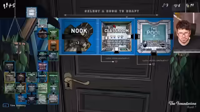 11:27:53Nachdem mehrere Räume gedraftet wurden, sucht der Streamer aktiv nach einem Weg zur Anti-Chamber. Es wird eine Strategie entwickelt, die das Finden von Hebeln in verschiedenen Räumen wie der Garage oder dem Gewächshaus beinhaltet. Die Boudoir wird gewählt, um Rerolls zu erhalten, und die Conference Room, um alle Items im Haus zu sammeln. Es wird versucht, einen potenziellen Eingang zur Anti-Chamber über die Archive zu finden.