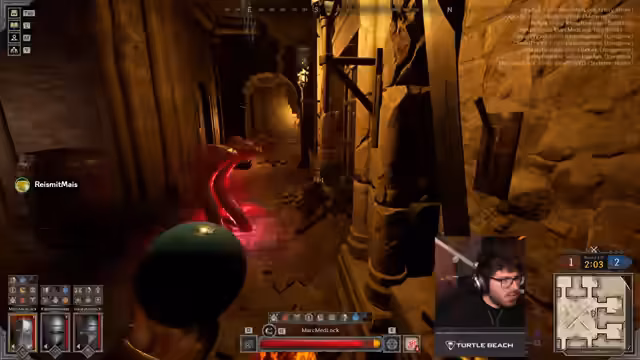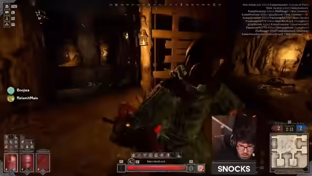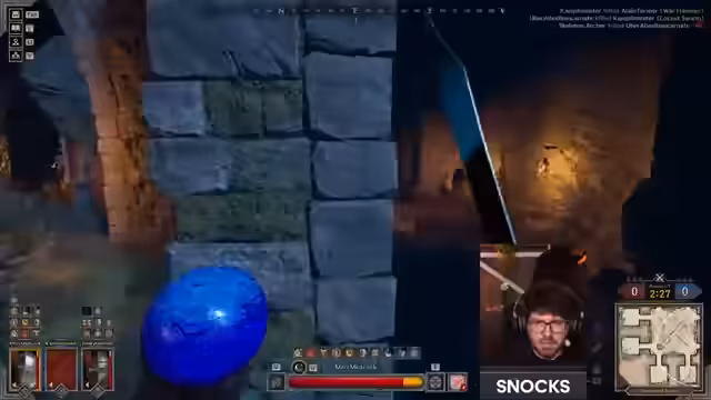 02:18:07Ein langanhaltender, chaotischer Kampf entbrennt, in dem das Team unter massivem Druck steht. Gegner drängen von mehreren Seiten vor und nutzen AOE-Spells wie Swarms. Der Streamer nutzt seine Bubble, um einen sicheren Vormarsch zu ermöglichen, während sein Teamkamerad den gegnerischen Wizard eliminiert. Sie erkennen, dass der zentrale Bereich zu gefährlich ist und sie besser Seitengänge nutzen sollten.