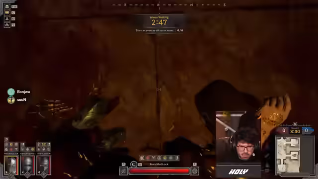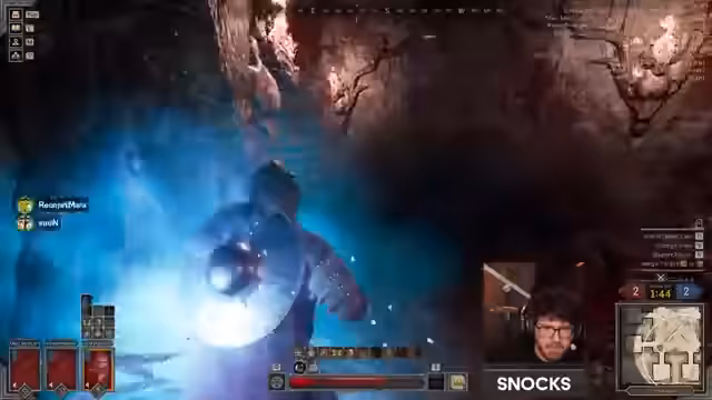 03:02:23Ein heftiger Kampf entbrennt in der Mitte des Spielfelds, bei dem der Streamer und sein Team gegen einen gegnerischen Fighter und Rogue kämpfen. Er bemerkt spät den aus dem Dunkel angreifenden Gegner, der ihn mit mehreren Treffern dezimiert. Trotz seiner Bemühungen, den Ranger abzuhalten und Teammitglieder zu unterstützen, wird er besiegt, was zu erheblichen Frustrationen über die unerwartete Aggression und den hohen Schaden führt.