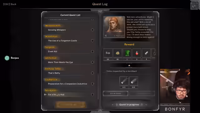 00:52:15Das Leveln im PvE erweist sich als zeitaufwendiger als erwartet. Um den Warlock schneller auf das benötigte Level 20 für die Arena zu bringen, entscheidet sich der Streamer, Quests zu erfüllen, die große Mengen an XP belohnen. Er kauft teure Quest-Artikel wie Thorn Batwings und Thick Pelts auf dem Markt, um sie direkt abzugeben und seinen Charakter extrem schnell auf Level 18 zu bringen, was die zuvor gemachte Erfahrung nutzt.