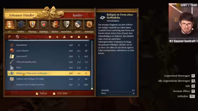 06:09:32Die nächste Mission führt den Streamer nach Troskowitz, wo er ein Dokument aus dem Rathaus stehlen soll. Er reitet nachts dorthin, um unerkannt zu bleiben. Auf dem Weg beobachtet er, wie ein Adliger von Banditen überfallen wird, und findet danach wertvolle Gegenstände auf den Leichen. Er trifft auf einen Raubzug von Krogmann, wird aber unerkannt fortgefahren. Im Rathaus angekommen, beginnt er mit der Durchsicht des Gebäudes auf der Suche nach dem Dokument.