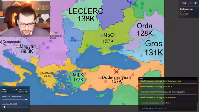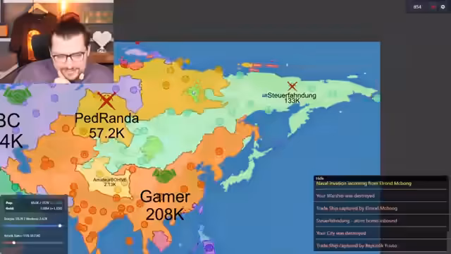 01:32:17Der Stream beginnt mit einer komplexen Lage im Spiel. Ein Spieler expandiert nach Nordamerika, während ein anderer, Yomi, die Antarktis und Australien kontrolliert. Ein dramatischer Wendepunkt tritt ein, als der Angreifer in Nordamerika zurückschlägt und Yomi unter Druck gerät. Gleichzeitig wird Yomi von einem dritten Spieler, Elrond, bedroht, was die Situation noch unübersichtlicher macht und dem ersten Spieler eine Atempause verschafft.
