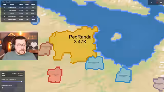 03:56:38Der Streamer gerät in eine Open-Front-Situation, wird von drei Seiten angegriffen und kann nicht gegenhalten, da er selbst nicht angegriffen wird. Er versucht, eine Insel zurückzuerobern, während er gleichzeitig eliminiert wird. Die meisten Spieler verlassen die Chat-Lobby, und eine neue Lobby wird eröffnet. Der Streamer versteckt seine Platzierung und erklärt die Win Condition des Spiels. Um einen schnellen ersten Hafen zu bekommen, müssen viele Leute eliminiert werden, was jedoch aufgrund der vielen Spieler schwierig ist. Der Streamer nimmt zunächst nicht viele Bündnisse an und beobachtet das Geschehen. Er muss Prime wie bei diesen, Freunde. Der Streamer expandiert in Richtung Westen und kann keine Freundschaften annehmen. Er kritisiert, dass alle Freundschaften schließen wollen, anstatt zu erobern. Der Streamer möchte den Grenzposten erobern und verbündet sich mit Ant. Yoshi will Freundschaft, was dem Streamer gefällt, da er hier abgesichert sein will. Er hat wenig Geld und muss mehr Worker bauen. Der Streamer möchte einen Zweitsitz errichten und greift Loki an, um Yoshi zu helfen. Er bricht ein Bündnis mit Glashin, da dieser zu offensiv ist. Optimus Prime hat sich in kurzer Zeit sehr krass ausgedehnt und mehrere Verbündete des Streamers angegriffen. Der Streamer verliert seine gesamten Truppen und wird von Muskelzwerg angegriffen. Er ist tot und scheitert in der Lobby.