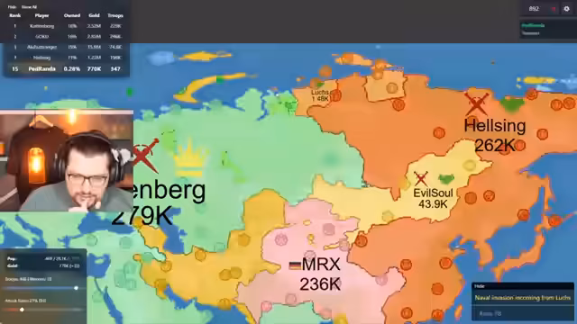 04:09:24Der Streamer konzentriert sich auf komplexe strategische Züge im Strategiespiel. Er analysiert die Handlungen seiner Mitspieler wie Ulrich, Evil Soul und Kuttenberg, koordiniert Allianzen und sucht nach Vorteilen auf der Karte. Seine Kommentare zeigen einen hohen Grad an taktischem Verständnis und die Notwendigkeit, sich in einem dynamischen Machtgefüge mit mehreren Parteien zurechtzufinden, die oft gegensätzliche Interessen verfolgen.