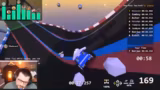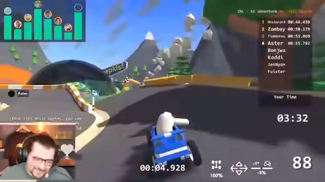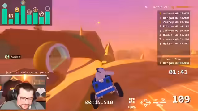 02:37:33Nach einer Halbzeitpause im Stream wird das Rennspiel intensiv fortgesetzt. Das Hauptthema ist der Wettbewerb um die schnellste Rundenzeit auf einer anspruchsvollen Map. Der Fokus liegt auf der Entdeckung und Anwendung von speziellen Fahrtechniken wie 'Wallriding', bei dem man sich an Wänden entlangreibt, um Geschwindigkeit zu gewinnen. Teilnehmer diskutieren ausgiebig, ob eine Route mit blauen oder roten Röhren vorteilhafter ist und wie man bestimmte Kurven und Sprungsequenzen optimal meistert, um Zeit zu sparen.