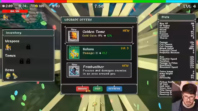 00:11:40Nach dem Freischalten der Wüste wechselt der Spieler zum Charakter Ninja. Das Ziel ist es, mit diesem Charakter einen Rekord aufzustellen. Der Build dreht sich um die Katana-Waffe, die durch das Brechen von Tumbleweeds auf der Wüstenkarte gefunden werden kann. Es werden verschiedene Upgrades wie Quantity, Crit Chance und Attack Speed getestet. Der Spieler findet eine Katana und baut einen Build mit drei Waffen auf, was ihn sehr motiviert. Es kommt jedoch zu Rückschlägen durch häufige Tode und das Gefühl, nicht genügend Schaden zu machen.