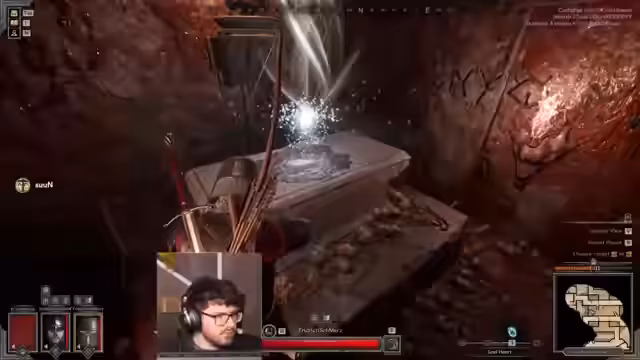 08:15:12Der Streamer erkundet die Lobby weiter auf der Suche nach Loot und findet mehrere seltene Ausrüstungsstücke. Nachdem er ein Team angegriffen hat, das in einer schlechten Position war, gibt er seinem Team Protection. Ein Golem greift ihn an, und es kommt zu einem Chaos, in dem das gegnerische Team gespalten ist und der Streamer einen Gegner tötet. Er beschreibt den Sieg als "glücklichen Zufall" und erwähnt einen taktischen Fehler, da er einen Gegner im Rücken nicht bemerkt hatte.