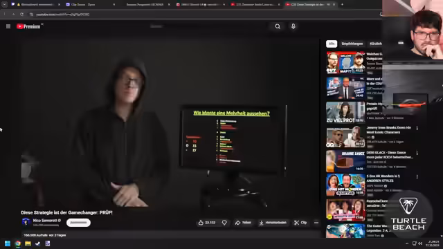 04:04:18Ein Video des Politikers Nico Semsrott wird angesehen und diskutiert. Darin schlägt er eine Strategie gegen den Rechtsruck vor, die darin besteht, den Bundesrat dazu aufzufordern, ein formales Prüfungsverfahren gegen eine verfassungsfeindliche Partei einzuleiten. Der Streamer und der Chat analysieren die Vorschläge, die Chancen auf eine Mehrheit im Bundesrat und die gesellschaftlichen Potenziale, wie z.B. die These, dass bereits drei Prozent engagierter Bürger für Veränderung ausreichen.