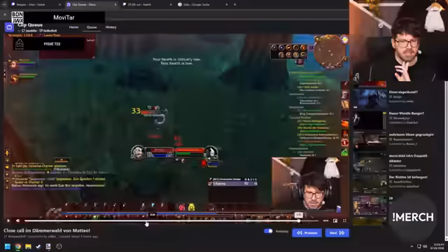 15:39:52Der Streamer konzentriert sich intensiv auf die bevorstehende Herausforderung. Da er den Inhalt von Gnomeregan schon lange nicht mehr gespielt hat, überlegt er, sich ein Video anzusehen, um sich an die gefährlichen Mechanics und den Weg zu erinnern. Ein Zuschauer schlägt vor, dass jemand anderes das Video schaut und Anweisungen gibt. Der Streamer erkennt an, dass einige Gegner im Dungeon, wie die Minenleger, extrem gefährlich sind und für einen sofortigen Ausschluss sorgen müssen. Die Verwirrung über eine abgebrochene Klassenquest erzeugt kurzzeitigen Stress, da befürchtet wird, die Fertigkeiten neu lernen zu müssen, was sich aber als weniger schlimm herausstellt als gedacht.