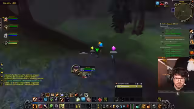 17:15:10Eine neue, anspruchsvolle Quest erfordert das Aufsammeln von radioaktiven Ablagerungen von getöteten Schleimen. Der Streamer und die Gruppe haben Schwierigkeiten, die Mechanik zu verstehen und korrekt auszuführen, was zu Verwirrung und mehreren Versuchen führt. Es wird klar, dass eine bestimmte Voraussetzung, ein grüner Debuff, erfüllt sein muss, bevor die Aktion gelingt.