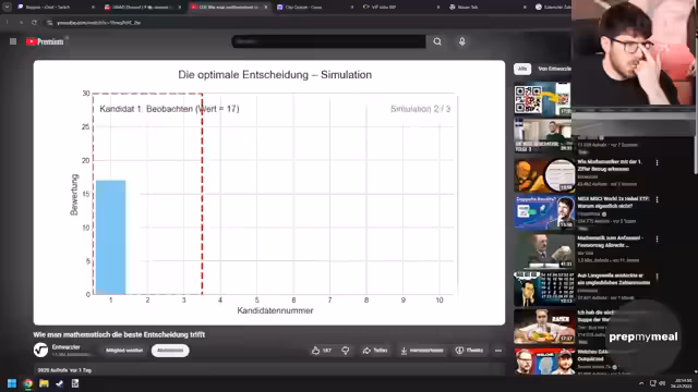 01:01:59Ein Video über die '37%-Regel' wird vorgestellt, eine mathematisch optimale Strategie zur Entscheidungsfindung, die bei der Wohnungssuche, Bewerbungen oder sogar beim Dating angewendet werden kann. Die Regel besagt, dass man zunächst 37% der Angebote ablehnen und sich das beste Angebot in dieser Phase merken sollte. Danach wählt man das erste Angebot, das besser ist als das bisherige beste. Der Streamer überträgt diese Regel auf Tinder-Dates und schlägt vor, die ersten vier Dates nur zur Exploration zu nutzen und dann die erste Person zu wählen, die besser ist als die beste der ersten vier. Es wird jedoch die Einschränkung diskutiert, dass diese Strategie nur funktioniert, wenn man die Gesamtzahl der Angebote kennt, was im Dating-Kontext schwierig ist.