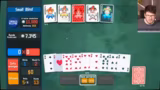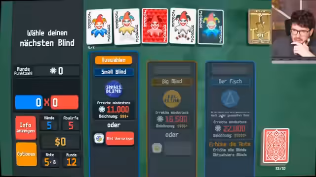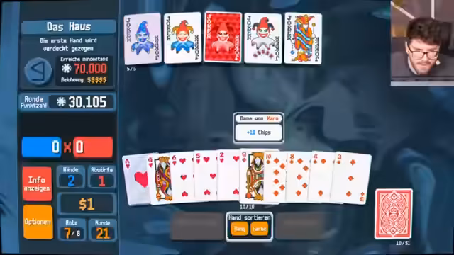 00:01:47Die erste Runde endet abrupt, als der Streamer die Bedingungen der Boss-Herausforderung versteht. Er muss in nur vier Händen 11.000 Punkte erreichen, was er als praktisch unm einschätzt. Nachdem er scheidet, analysiert er seinen Fehler: Er hat die Herzkarten nicht konsequent genug für einen Flush gesammelt, anstatt sie wegzulegen. Er erkennt, dass er Karten nicht abwerfen kann, während sie auf der Hand liegen, und dass eine bestimmte Kombination nötig gewesen wäre, um die Punktzahl zu erreichen. Diese erste Runde dient als Lektion für die nachfolgenden Versuche.