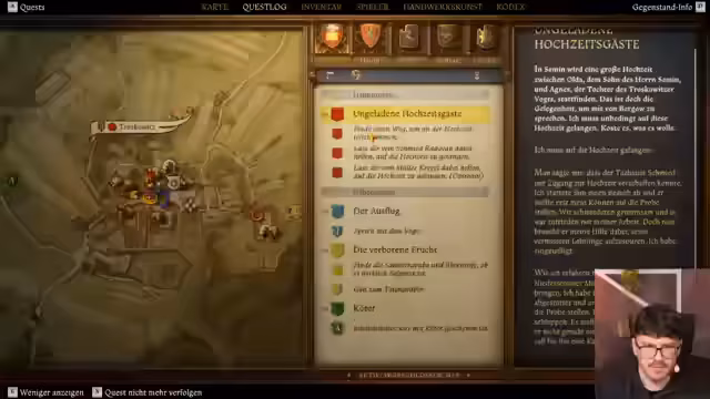 06:38:51Es wird ein intensiver Kampf gegen den Vogt beschrieben, bei dem dieser betäubt wird und dessen Waffen, eine Brosche, ein Brief und ein Schlüssel, erbeutet werden. Anschließend wird die Quest aufgegriffen, die darin besteht, den bewusstlos gewordenen Vogt zu Hersemin zu bringen. Dabei wird die Überladung der Spielfigur thematisiert, die es notwendig macht, Gegenstände wie ein Breitschwert und einen Knüppel abzulegen. Die Quest erfordert das Warten auf die Rückkehr von Herr Semin und Knorren.