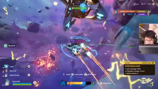 01:13:47Nach dem Sieg gibt es eine Diskussion über den Ausgang des Kampfes. Der Streamer ist unsicher, ob die Minen oder die Elektrofähigkeiten den entscheidenden Schaden verursacht haben. Ein Teammitglied hat versehentlich auf die Minen anstelle des Elektroziels geschossen. Das Spiel wird als "Sea of Thieves mit Raumschiffen" und "Battle Royale" beschrieben. Als besonders episch wird ein Reddit-Clip erwähnt, bei dem ein Spieler ein Artefakt klaut, durch ein Portal teleportiert und von einem Mate mit einem Traktorstrahl eingefangen wird.