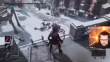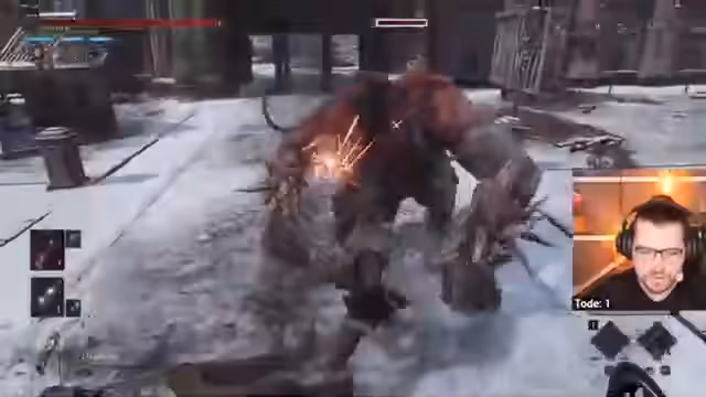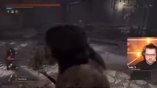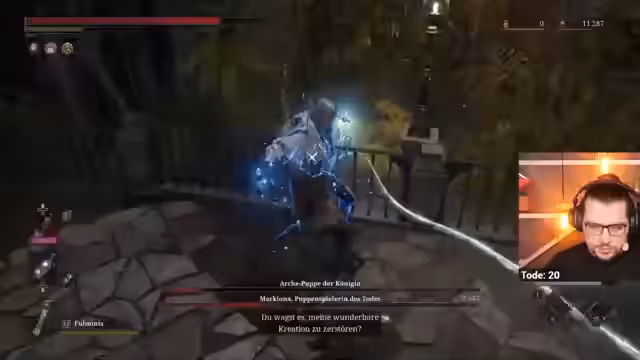 01:58:13Zu Beginn des Streams wird eine Einordnung in die Geschichte des Spiels vorgenommen. Der Streamer spricht über die Bruderschaft der Wahrheit und die Figur Marciona, die das Geheimnis der heiligen Dienstmädchenpuppe entdeckte, welches die Tür zur Unsterblichkeit öffnen sollte. Im Gameplay wird der Streamer in die Vergangenheit versetzt und trifft auf den Boss Manus, eine Schlüsselfigur der Handlung, die im Hauptspiel bereits bekannt war. Dabei geht es auch um die Mechanik des Parryens und des Ausweichens als verschiedene Kampfstrategien gegen Bosse.