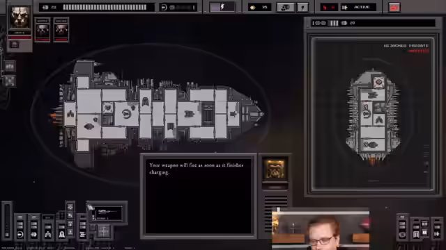 01:14:22Nach der anfänglichen Diskussion beginnt der Streamer mit dem Gameplay und stellt erste Parallelen zu FTL fest. Die Steuerung über eine Sektorkarte, der Aufbau des Schiffes mit Systemen wie Waffen, Schilde und Antrieb sowie der erste Kampfverlauf werden als sehr ähnlich zu FTL beschrieben. Eine erste, kleine Abweichung ist das Vorhandensein eines Boarding-Systems, bei dem eine Crew in einem Assaultsled auf gegnerische Schiffe geschickt werden kann, um Systeme zu sabotieren. Der Streamer testet diese Mechanik erfolgreich.