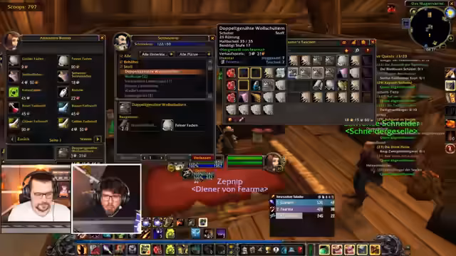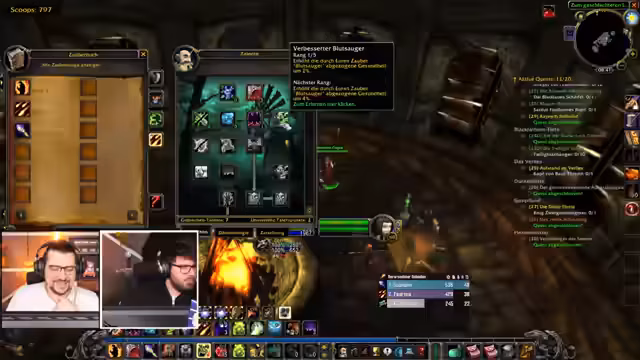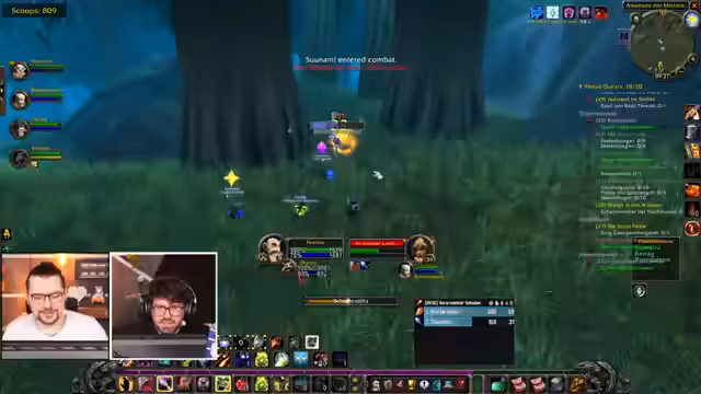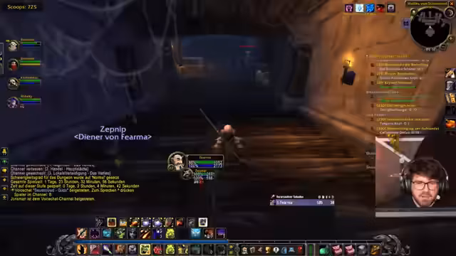 01:40:54Die Gruppe spielt das Verlies Deadmines, wobei der Fokus auf strategischem Vorgehen und Spielmechanik liegt. Der Streamer, der als Tank fungiert, zieht Gegner in den großen Raum, um Platz zu schaffen. Es werden Add-ons wie "Skorps" für Crit-Anzeigen erwähnt und die Teamarbeit bei der Bewältigung der Gegner hervorgehoben. Während des Spielens tauchen humorvolle Momente auf, wie der unabsichtliche Angriff auf einen Mitstreiter, der als Gegner identifiziert wurde.