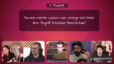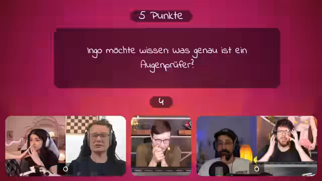 02:46:09Der Stream beginnt mit dem Aufbau eines teambasierten Quizspiels im Stil von 'Genial daneben', das als Team Edition konzipiert ist. Dabei gibt es die Regeln, dass Teams den Ball werfen, raten und bei falschen Antworten einen Tipp erhalten und die Punktzahl sinkt. Die Gäste Jan Gustafsson, Edo P und Matteo treten gegen den Streamer und Gastmoderator Andi an. Bevor das Spiel beginnt, wird der erste Spielzug der gegnerischen Team Matteo und Edo eingeleitet. Die erste Frage lautet: 'Was ist ein Augenprüfer?', was eine sofortige und unkonventionelle Ratrunde auslöst, in der spekulative Theorien von Optikgeräten über Tiere bis hin zu U-Boot-Fenstern geäußert werden.