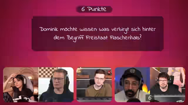 03:31:11Die dritte Frage des Quizspiels für 10 Punkte lautet: 'Was verbirgt sich hinter dem Begriff Freistaat Flaschenhals?'. Das Team versucht zunächst, den Begriff zu deuten, indem es an Flaschenform, Bierkultur und politische Engpässe denkt. Als der Hinweis gegeben wird, dass es sich nicht um übertragene, sondern um geografische Formen handelt, wird geraten, dass es sich um eine historische Territoriumsveränderung nach dem Ersten Weltkrieg handelt. Theorien werden darüber angestellt, wie ein Restterritium durch Kriegsfolgen die Form einer Flasche annehmen könnte. Die abschließende und richtige Lösung enthüllt, dass der Begriff 'Freistaat Flaschenhals' für ein fiktives Konstrukt steht, bei dem nach einem Krieg die Grenzen zwischen zwei Siegermächten mit einem Zirkel auf der Karte gezogen werden, wodurch ein schmales, flaschenhalsartiges Restterritium für den Verlierer entsteht.