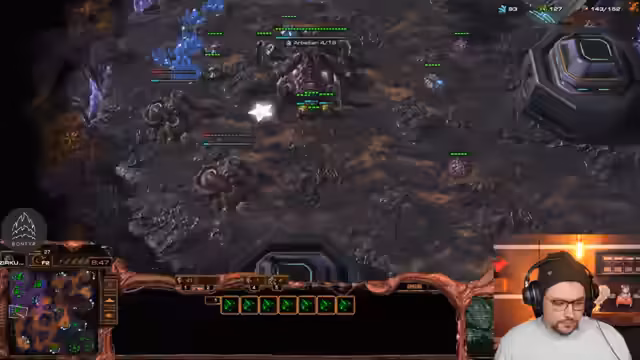 06:39:58Das erste Spiel zwischen dem Streamer und Grubby beginnt in StarCraft 2. Beide Spieler agieren professionell und setzen verschiedene Strategien ein. Der Streamer setzt auf einen Skytoss-Angriff, während Grubby mit Banelings kontert. Das Spielverhalten zeigt beider technische Fertigkeiten und taktisches Geschick. Der Streamer verliert trotz guter Leistung und analysiert die Gründe für seine Niederlage, wie die unvorbereitete Armee-Zusammensetzung und die schnellen Entscheidungen des Gegners.