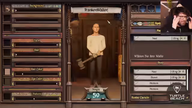 10:33:48Nach den vielen Gesprächen wechselt der Streamer das Spiel und startet in 'Dark & Darker'. Vor dem Start muss er sich kurz aus dem Spiel ausloggen, um einen WoW-Schande-Videoclip zu vermeiden. Es wird die Einstellung des Spiels besprochen, wobei die Chat-Mitglieder darauf achten, dass das Spiel auf Englisch ist und die Gewaltdarstellung auf 'grotesk' eingestellt wird. Der Streamer entscheidet sich für den 'Fortschrittsmodus' und wählt einen Namen für seine Spielfigur ('Frankenballer'). Anschließend sucht er eine passende Startwaffe und beginnt das Spiel, nachdem die Lautstärke angepasst wurde.